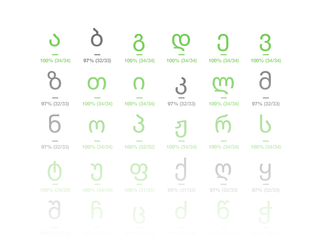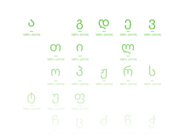 Here is your overall progress in learning the alphabet. Green letters are those you know well, while dim letters are those you need to master—the dimmer the letter the more learning it needs.